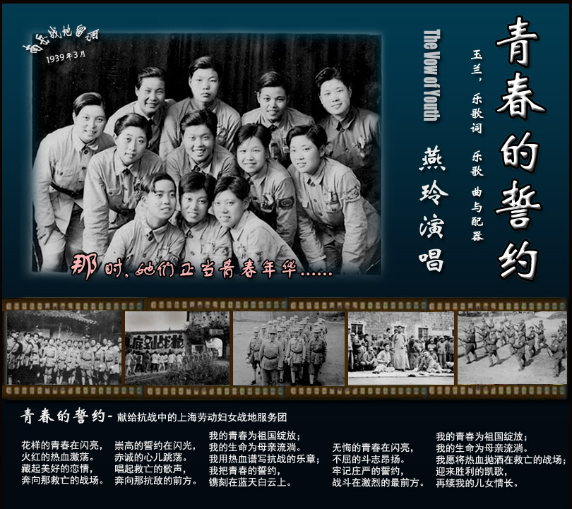 1937年10月在淞沪抗战最悲壮、最激烈的时刻,全国抗敌后援委员会副主任何香凝女士委派她的秘书, 著名的反法西斯战士胡兰畦,率领由上海女青年会女工夜校学员组成的上海劳动妇女战地服务团十八人,奔赴淞沪抗战前线。出发前她们誓言抗战不胜利决不婚恋。三年来,她们跟随抗战国军某部转战二万多里,足迹遍布沪、苏、皖、赣、浙、鄂、湘和豫八省市。在转战中,她们经受住爱情与誓言的情感矛盾与选择,以及战地生与死、血与火的考验。到1940年10月这支团队发展到近四十人。她们从事战地服务动员,协调军民关系,协助救护伤员,查处敌特汉奸;为抗战军民慰问或抗战动员演出几百场, 组织成立了六十多个抗日儿童团,开办了二十多个妇女识字班,印刷出版了数十万份自编抗战期刊,动员了无数百姓投入全民抗战。为民族的独立与解放,奉献自己的热血与青春,做出了不可磨灭的贡献,受到国共领导人的高度赞扬。她们不愧为中国妇女抗战的杰出代表!