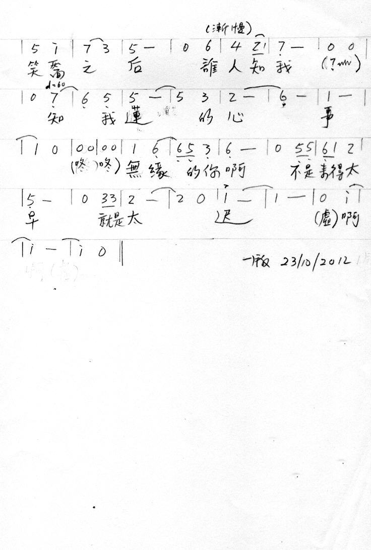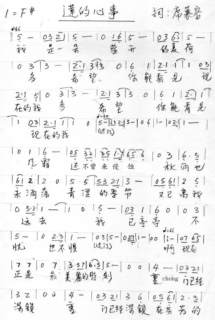 莲的心事难懂,莲的心事难唱。 莲调低,难开口诉说心事。 莲高雅,无奈天气渐,冷喉咙已开始痒痒。 风霜明明已侵蚀, 艺术的殿堂已经深锁,最美丽的嗓音已经错过。 莲的心事,你懂你说?