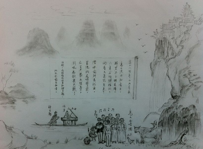 这几天高山群英荟萃,好戏连台,首页换得好快,真是目不暇接。咱今儿也来凑个热闹,赶了个末班车,搞了点自制的土特产送来了,礼轻情意重哈。是一幅有关咱们高山自己的油诗漫画,硬搭了一首《知音》, 是冲着歌名来哼哼的,用iPhone外录的,有点噪音。对不起了,近来伤风感冒折腾了一阵子,唱得时候带点’伤感’,门路阻塞。嘿嘿,我把时空给挤扁了一下:图中的两个古人就是高山流水觅知音的典故中春秋时代的琴师俞伯牙和樵夫钟子期。我还把星海牌baby grand钢琴运到了一叶扁舟上去了,雇了伯牙给我们高山合唱团伴奏。合唱团里以一当十全都代表了。。图里还包埋着我所知道的一两件高山的趣人趣事。。。呵呵。当下世事多难,衷心祝愿网友们在寄予心愿的的时刻,珍惜自己的已有和上帝的恩赐,过好自己所能把握的每一天,我们能在一起交流就是希望彼此过得好。。。不过提一句,山庆过后,可能大腕们又要去练水性了,大伙儿别潜水太久了哈, 咱这首诗等着你不断冒泡呢。祝新的一周愉快。 (图可以放大看) 末班车随笔: 高山八周年山庆有感 高山流水知音台,群贤毕至朋友拜。 八年光阴弹指间,问有几复能再来? 潜水俞钟意犹在,冒泡网友情挚爱。 众生共聚庆盛事,引吭高歌赛天籁! 注:‘俞钟’指俞伯牙和钟子期,在此引喻为知音。 2013年4月