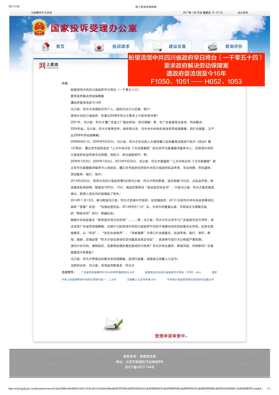 致:中共中央。 希望中共政府有點人性 及時頒發無國籍人士證書 2001年,我遭廣東省工廠強迫勞動、拒付報酬、等,依法訴至最高法院後,打擊報復,又產生2008年勞動保障案。其中,2010年3月8日,最高法院206號接待室告知已經立案,並收了材料,至今7年不給判決結果; 2014年起,最高法院法警以2013年實施的《民事訴訟法》第209條:“向檢察院申請檢察建議或者抗訴”將我拒之門外(最高檢察院要有最高法院處理文書才受理),拒不執行《中華人民共和國憲法》第127條:“上級法院監督下級法院的審判工作。” 俗話說:“上梁不正下梁歪”,這是中國百姓最大的不幸。 在中共奪得政權初期,就頒布了《中華人民共和國憲法》,就證明了“依法治國”。當今,“依法治國”的口號喊得震天響,不但不執行,還對要求依法解決問題的老百姓推諉扯皮,販賣,瘋狂打壓。所以,目前所謂的“依法治國”,也只不過是塊遮羞布。 老百姓敢不依法嗎!是政府官員,所謂的政客們不依法、不守規矩、不知廉恥。 在中共政府打土豪分土地時代,我的父輩與祖上仍然擁擠在自己修建的茅草屋內,沒去哄搶地主的房屋;在你們高喊着:“不管是白貓黑貓抓住老鼠就是好貓”之後,染色饅頭、蘇丹紅雞蛋、地溝油、注水豬肉、毒奶粉、假藥、血徵地、血拆房、跳樓自焚殺人討薪、……,在騙子滿天飛、強盜遍地跑的今天,我老老實實做人,實實在在做事,長期滿足了工廠強迫日工作14小時,工廠拒不按約定支付工資、加班工資,未達強迫日工作16小時就招致停工、記過、罰款、辱罵,政府不管,迫於無奈,辭工就扣違約金。我依法訴求至今天,不但未得到解決,還屢遭註銷戶口的流氓中共四川省政府下至我無中生有的雙龍場居委會毫不知羞恥的欺凌。 在中共政府故意製造貧困今天,我長期沒耕地、沒工作,連在廣東省辦理的居住證件都遭流氓中共四川省政府哄搶了。在這度日如年的16年裡,中共政府“為人民服務”的口號喊的震天響,不但拒不給我解決實際問題,還慘遭其萬般欺凌。 我萬般無奈,所以,不想再看到最虛偽、最黑暗、最無恥的你們; 目前,我不存在還要申請退出中國國籍,希望中共政府有點人性,及時督促北京市公安局給我頒發無國籍人士證書。 廣東省法院判決名:馮少波、流氓中共四川省政府欺凌名:何大才,聯繫電話:+86 18301293115 。 |