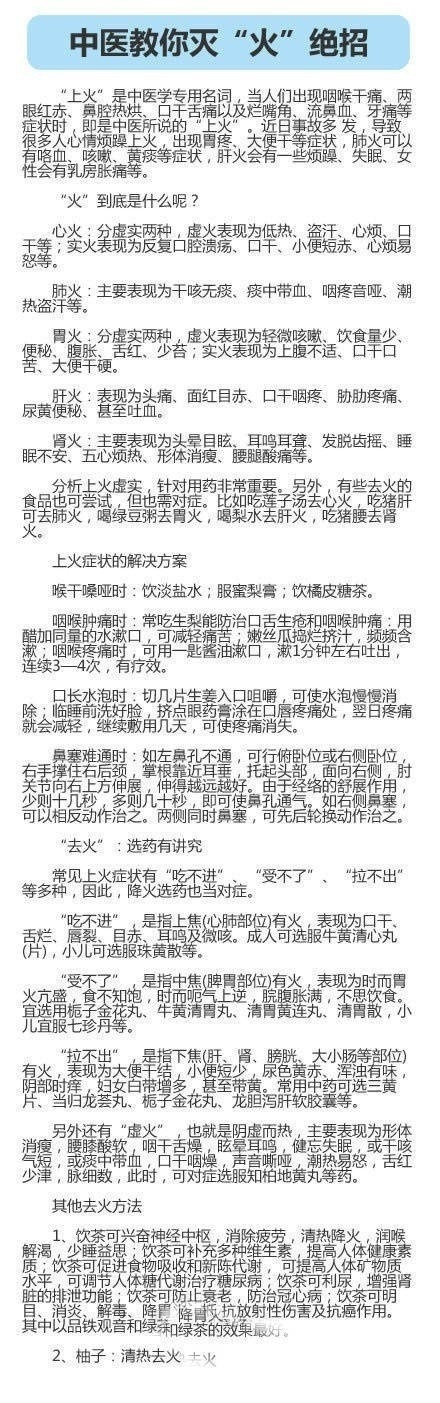 当人们出现咽喉干痛、两眼红赤、鼻腔热烘、口干舌痛以及烂嘴角、流鼻血、牙痛等症状时,即中医所说的“上火”。导致很多人心情烦躁上火,出现胃疼、大便干等症状,肺火会有咯血、咳嗽、黄痰等症状,肝火会有一些烦躁、失眠、女性会有乳房胀痛等。