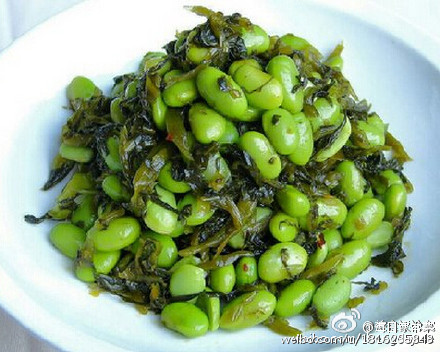 【毛豆雪里红】1.新鲜的雪里红切碎,撒盐腌制十分钟出水,然后把汁挤干净备用2.锅内放油,毛豆先入锅煸炒,变色后把挤干水的雪里红倒进去翻炒均匀,加盐,糖继续炒3.待食材都成熟后撒鸡精就可以出锅了。