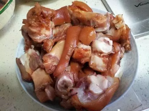 斬開豬蹄, 開水一抄,洗淨血沫,上一鍋涼水,下入豬蹄塊,加醬油,料酒,精鹽,老抽,糖,姜,蔥,大料,丁香,肉桂,山萘,白芷,砂仁,豆蔻 大火燒開,微火慢燉,直至軟爛,浸一夜,撈出涼後食用,香!爛!