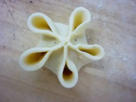 把麵團搓條,下劑子擀皮,包入餡心。把圓皮均分5點,粘在一起形成5條邊,把口捏緊