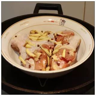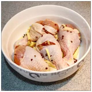 ▼1、鸡腿洗净,在两面各划几刀,便于入味,戴上手套,用手将盐在鸡腿表面抹均匀,加入姜丝、花椒和料酒,腌制2个小时。