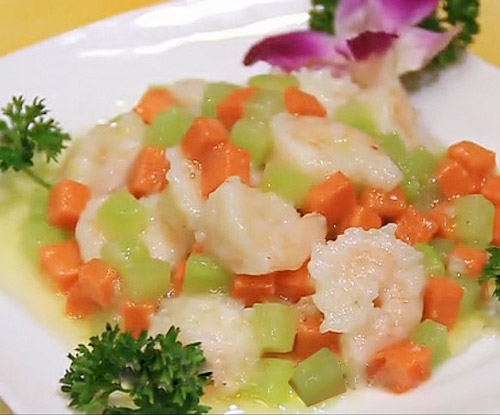 芡粉浓稠时,倒入虾翻炒均匀,出锅前加入油脂。这道菜的特点是晶莹透亮,咸鲜味香。