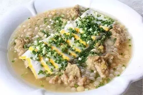 制作: 1、把净草鱼肉捶成泥,与猪肥膘肉泥一起搅匀并调味后,入笼蒸成鱼糕,将鱼糕切成厚片待用。 2、把鱼骨块裹匀全蛋糊,然后下到热油锅里炸成小酥肉;把秤砣菜投入沸水锅,煮至八分熟便捞出来。 3、取一汤碗,先把煮过的称砣菜和小酥肉垫底,铺上鱼糕片并灌入高汤后,调入盐、味精、鸡精和胡椒粉,然后入笼蒸1小时,取出来后撒些小葱花,即成。 |