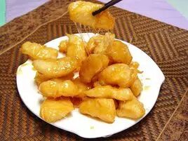 3)將炒勺內油倒出,留余油15克,將白糖200克放入鍋中、不停地攪動,使糖受熱均勻熔化,但火不宜太大,等糖液起小針尖大小的泡時,迅速將炸好的芋頭塊倒入,顛翻均勻後,盛盤急速桌。