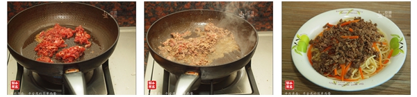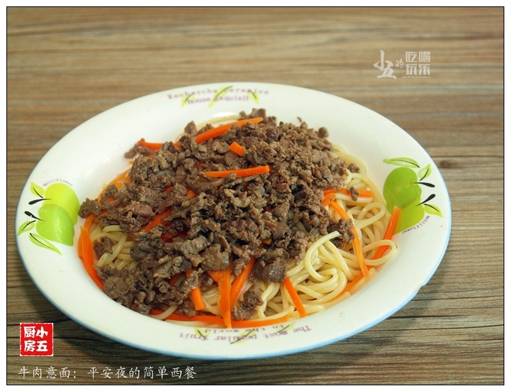 【做法】 1、准备好牛肉。 2、洗净,剁成肉酱。 3、加入黑椒,生抽与1/2汤匙的玉米油拌匀,腌制10分钟。 4、红萝卜削皮,切成丝。 5、煮开水,加入盐。 6、下意大面,大火煮开,转中火煮10分钟左右。 7、将煮好的意大利面捞起,放入盘中。 8、原锅下红萝卜丝。 9、大火烫熟,捞起放在意大利面上。 10、热油下牛肉酱。 11、大火翻炒至肉酱断生。 12、将炒好的肉酱放在意大利面上。 【小五食记】 不同牌子的意面,可能煮的时间不同,最好是根据意面外包装的说明进行调整。 |