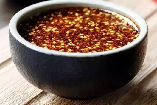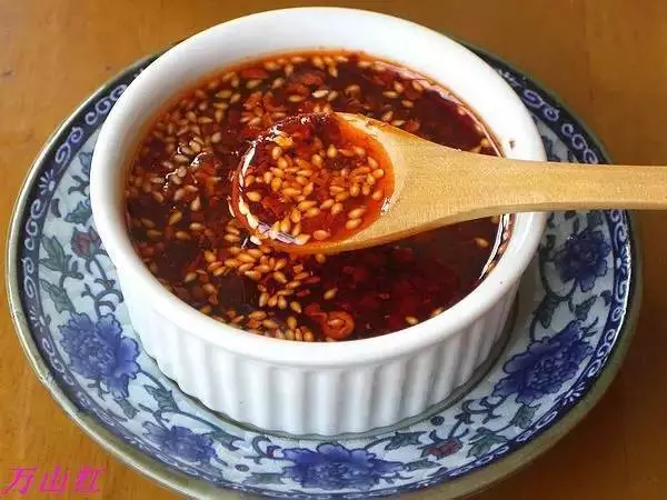 2.另起锅,入菜油,四成热时,下姜片、小葱炸至干香时,熄火,冲入装有糊辣椒末的盆中,搅拌至四成热时,放入花生米、熟芝麻,封口即成。特点 色泽深红,辣味十足。