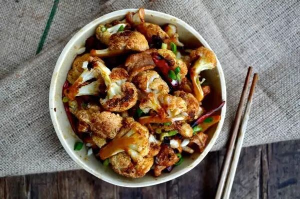 步骤四:在锅中加入食用油,然后放入生姜、大蒜和干辣椒,翻炒10秒再加入料酒,并立即添加麻油,酱油,糖,水,一起翻炒以后,加入之前的花菜,炒熟即可。