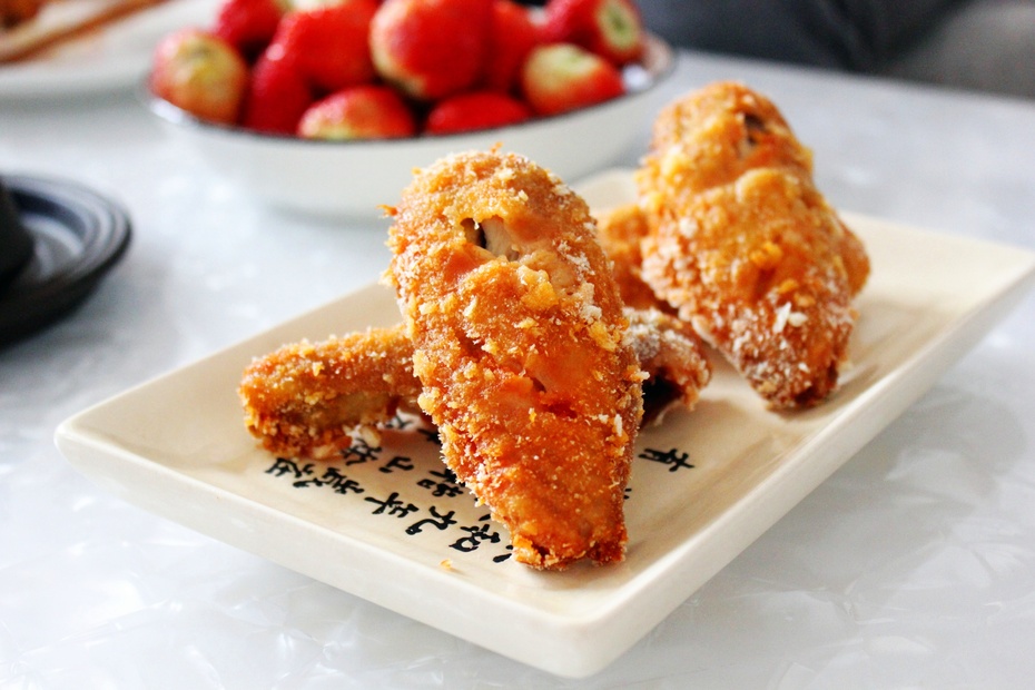 5.微波炉中高火工作3分钟的时候,就能闻到香味飘出来了,4-5分钟的时候,可能会听到噼啪的鸡皮爆裂声,6分钟就可以吃到外焦里嫩的炸鸡翅了!不过,因为鸡皮被快速加热有可能产生爆裂,面包糠可能会蹦到微波炉内壁上,所以炸完鸡翅之后要注意清洁微波炉哟!