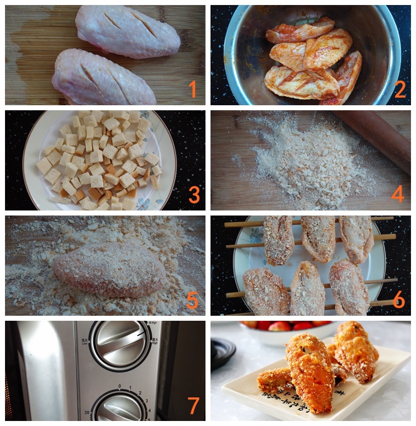 3.如果家里有现成的面包糠当然更好啦。如果没有,就可以采用我用的方法,微波炉高火2分钟将面包片打脆,用擀面杖略微压一下就是很好的面包糠了。或者你更懒,连微波炉都懒得用,还有一个办法,就是面包片切丁放在塑料袋里,敞口,放在暖气片上过夜,第二天面包丁就脆了,也可以压成面包糠了。不过第二种方法只能在冬天有暖气的时候用啦,有时间局限性。