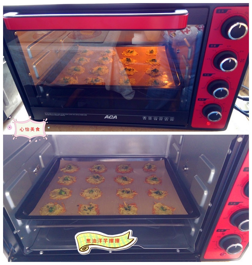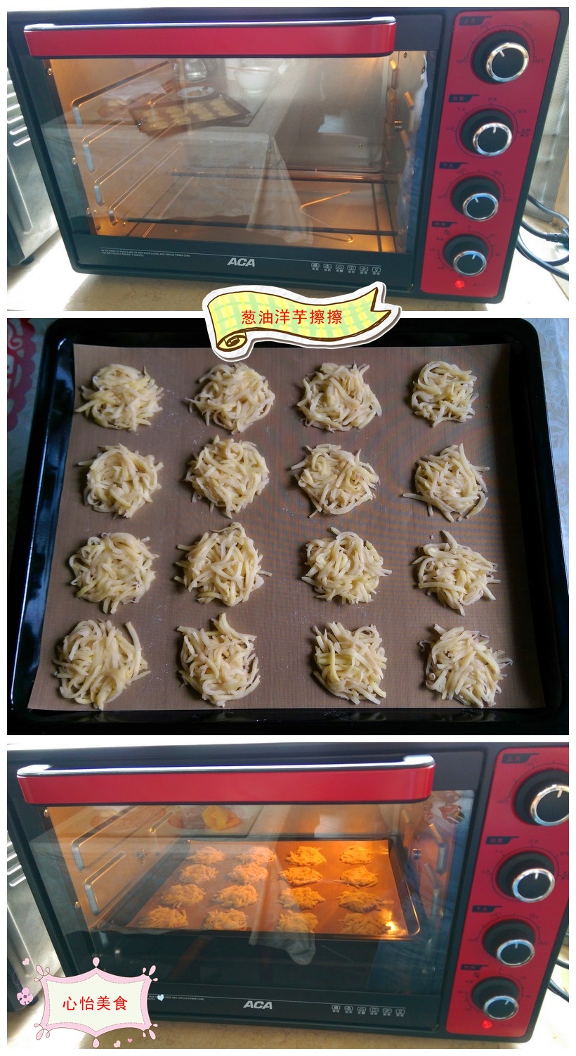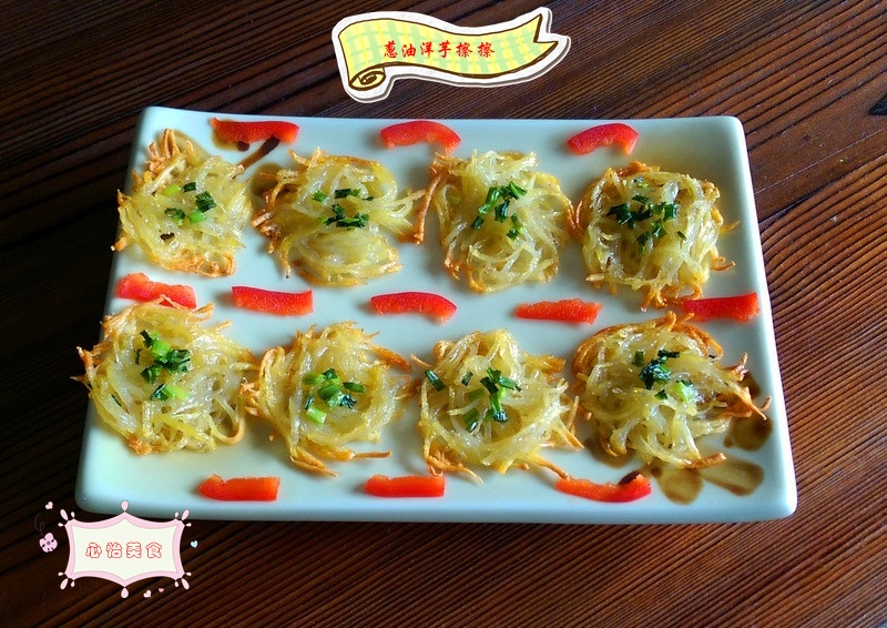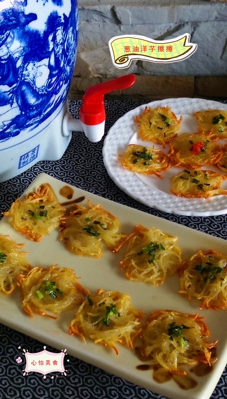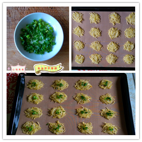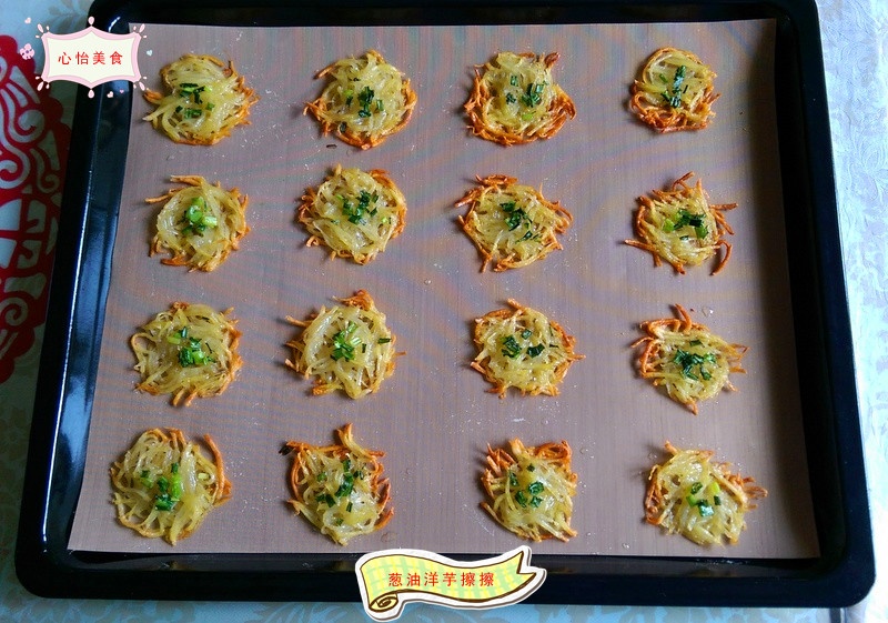 洋芋擦擦,一道随着舌2红遍大江南北的美食,说实话,土豆丝、土豆片、土豆泥、炖土豆、烤土豆都有吃过,唯独这洋芋擦擦还未曾尝过,于是就用烤箱做了一道葱油洋芋擦擦,当成品从烤箱出炉的那一刹那,好有成就感的赶脚。 食材:土豆 调料:小葱、食用油、盐 制作方法: 1、将土豆去皮用刨丝的工具擦成丝; 2、取少许盐将土豆丝腌制10分钟; 3、挤去腌制后渗出的水分; 4、往土豆丝里加1小勺土豆淀粉拌匀; 5、烤箱预热170度; 6、取一些土豆丝将其按压在垫了油纸或锡纸的烤盘上,依次码放整齐; 7、将烤盘送入烤箱倒数第二层,上下火170度烘烤约10分钟; 8、将葱切葱花,放入料碟中,淋入熬热的食用油,做好葱油; 9、在土豆丝上薄薄地刷上一层葱油,再将葱花分别码在土豆丝上; 10、将烤盘再次送入烤箱,上下火170度烘烤约8分钟,即可。 哇哦~~洋芋擦擦被镶了一圈金边,太漂亮了。没等得及晾凉,就心急地尝了一块,葱香非常浓郁,边缘的口感松松脆脆的,中心吃起来是酥软而柔韧的,用来当作解馋的小零嘴、下午茶茶点或是佐酒小菜都非常的不错,哦,对了,吃上几片还挺有饱腹感的,个人觉得当作减肥餐也挺合适的呢! 小提示: 1、土豆丝腌制的过程中会有些氧化,但是不用担心,挤干水分的时候,氧化的色素会随着水分被大部分去除掉; 2、土豆丝排放在烤盘上,按压几下就可以了,无需过度整形; 3、葱花不直接拌入土豆丝,一是为了制作葱油的需要,二是晚点放烘烤出来的颜色更好看。 |