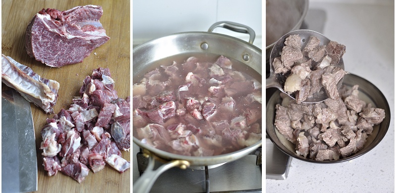 1、牛腩切成大块。 2、锅里倒入清水,倒入牛腩块煮开焯水。 3、捞出焯过水的牛腩。