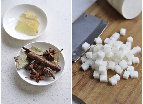 生姜切大片,八角、桂皮、草果,香叶洗净备用。萝卜洗净后切方丁。
