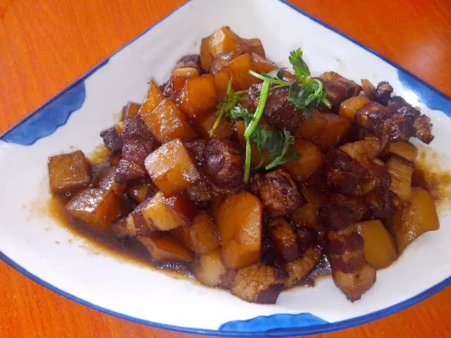 原料:五花肉,白萝卜,葱,姜,香葱,酱油,白糖,桂皮,大料。 1.将五花肉切成块,白萝卜切滚刀块备用。 2.将白萝卜过开水焯烫后取出,锅中倒入油,将桂皮、大料煸香后放入五花肉,不断煸炒至肉上色,调入酱油、白糖,冲少许开水,小火炖20分钟,加入白萝卜炒匀,出锅撒上香葱末即可。