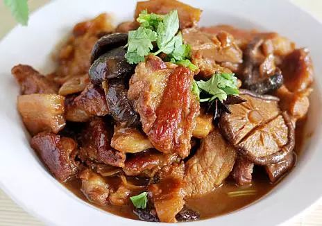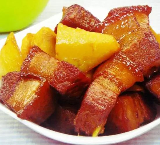 原料:带皮五花肉500克,土豆250克,大蒜3粒,姜1小块,八角3粒,桂皮1根,草果1粒,生抽1汤匙,老抽2汤匙,盐6克,冰糖20克,料酒1汤匙。 做法: 1.五花肉洗净,切成方块,锅里放入冷水盖过猪肉面﹐大火滚15分钟后,用冷水将肉冲洗除去生肉味﹐抹干。 2.姜切片,大蒜去皮,拍扁;香料洗净。 3.土豆去皮,切块,备用。 4.锅中放油,趁油凉时放入大蒜,葱,八角,桂皮和草果,炒出香味后,倒入五花肉翻炒变色后,继续煸炒2分钟直到出油,放入生抽,老抽,盐,冰糖和料酒,不断翻炒5分钟左右,使其上色。 5.再加入清水(水量要没过肉面),用大火烧开后,改用小火炖45分钟,放入土豆块,再煮15分钟,待土豆入味后,调成大火待汤汁浓稠,上碟即可。