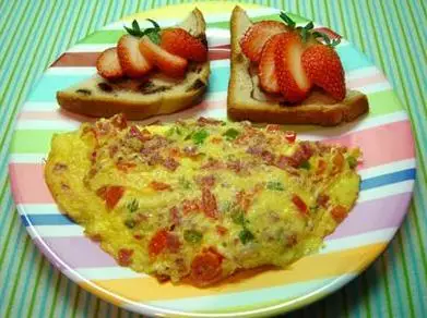 做法 1.蛋兩個打散,加少許鹽 2.美式火腿肉一小片切碎,番茄去皮切碎,蘑菇,青紅椒切碎 3.平底不沾鍋上放奶油一塊,待油熔化後加入火腿及各式蔬菜丁翻炒至熟 4.將蛋液徐徐倒在上面,小火將一面煎熟;小心翻面續煎至熟 5.小心將蛋餅放置盤上,翻轉一半呈半圓狀即可