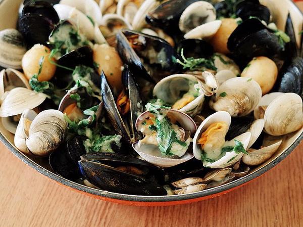 煮各种贝的时候用白葡萄酒比较多,找到一张旧图是煮综合贝类。我自己对酒味接受度比较低,所以喜欢的比例是白葡萄酒:水=1:3的样子来煮贝壳们,供参考。