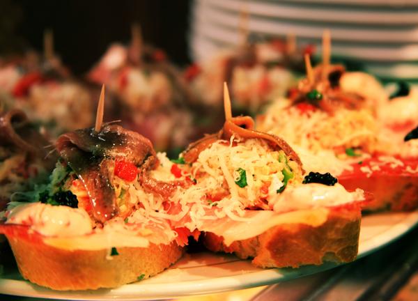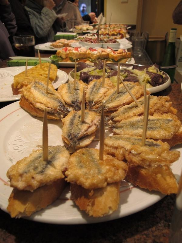 午餐时,当地人几乎都在吃 Pinchos,其实就是用竹籤串起來的 Tapas