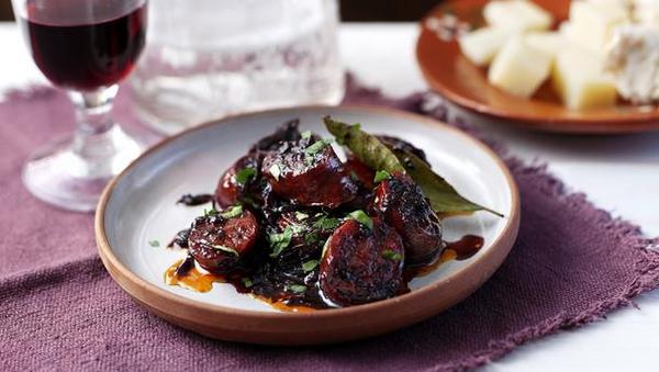 用腌好的猪腩肉和西班牙特色辣味猪肉香肠 Chorizo 和血肠,白芸豆、再加藏红花、黄油下去炖煮而成。西班牙有各式美味到香肠,像加泰罗尼亚地区的