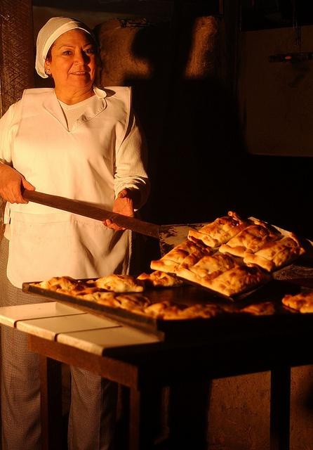 做法大概是,先放一层油酥面皮,再放上炒过的洋葱,大蒜、辣椒,大量的橄榄油等