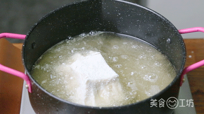 5. 油温6成热,将豆腐下锅炸,翻面炸至微黄。