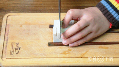 1. 千页豆腐切成方块。底下垫两根筷子,先切成片,后切成条。