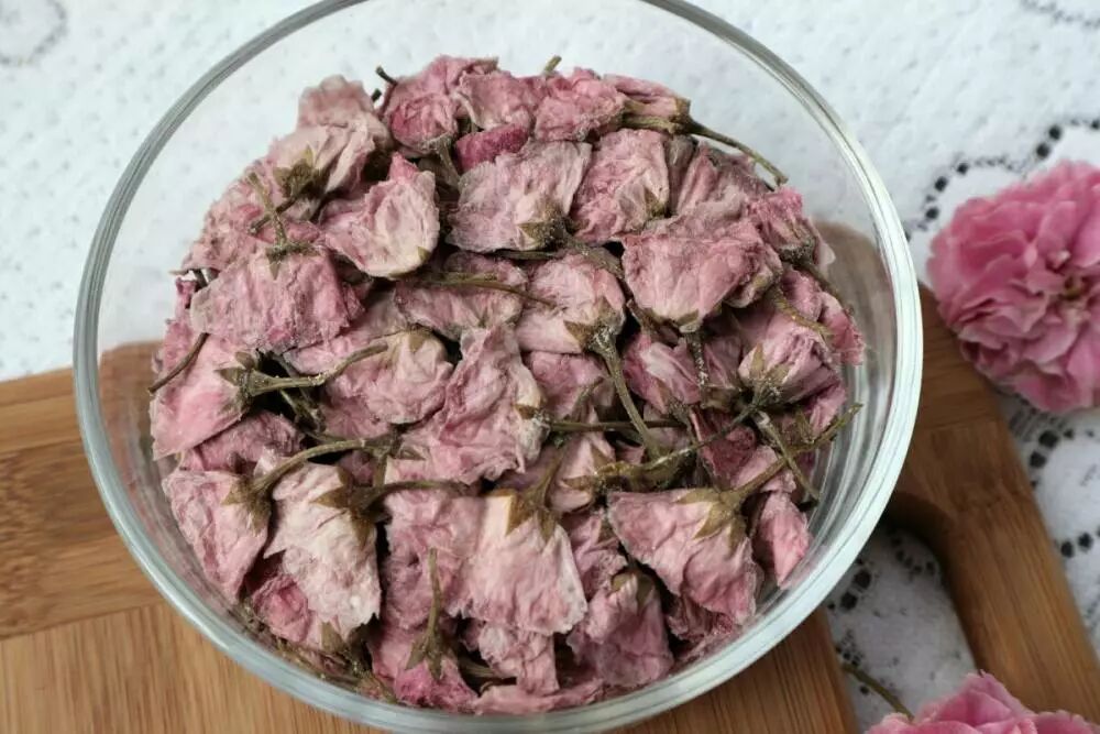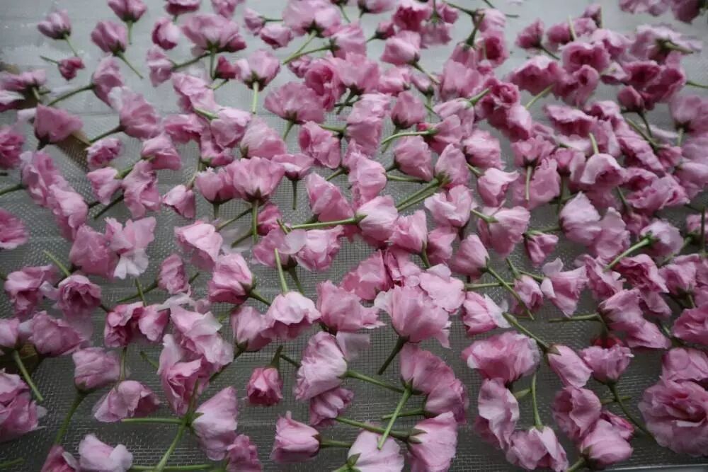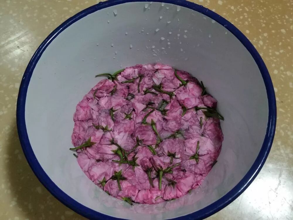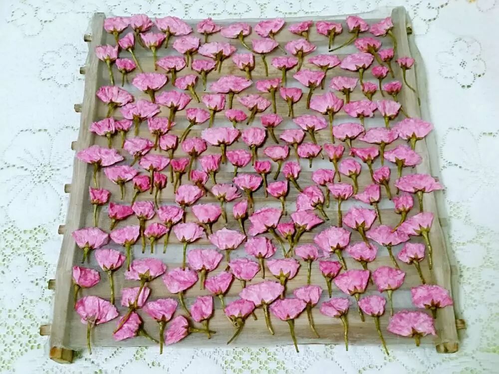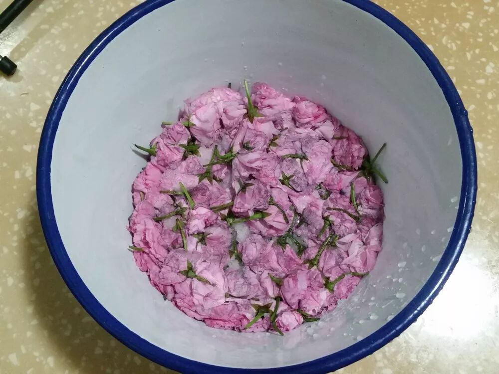 1. 盐渍樱花要选八重樱中的关山樱,这种樱花花叶同期。4月正值花期。新鲜采摘四、五分开放的樱花,放淡盐水中浸泡1个小时,洗净。2. 放帘子上在阴凉通风处晾干。3. 用干净的毛巾把里面的水也吸干。4. 取个深盆,先撒上一层盐。5. 摆上一层樱花。6. 就一层盐、一层樱花,直至把全部樱花腌好,上面再撒上一层盐。7. 用重物压在上面,我用小一点的罐子装上水来压,压三天。8. 三天之后樱花渗出了很多水分,把水分倒掉。9. 倒入米醋,分量大概是樱花分量的四分之一。10. 浸泡4、5天后,把樱花取出放帘子上阴干,记得不要放在太阳底下晒哦。11. 大概晾了三天,花已经干了。12. 表面上有一层盐,也可以再撒点盐,放保鲜盒中可以保存一年多时间呢。
