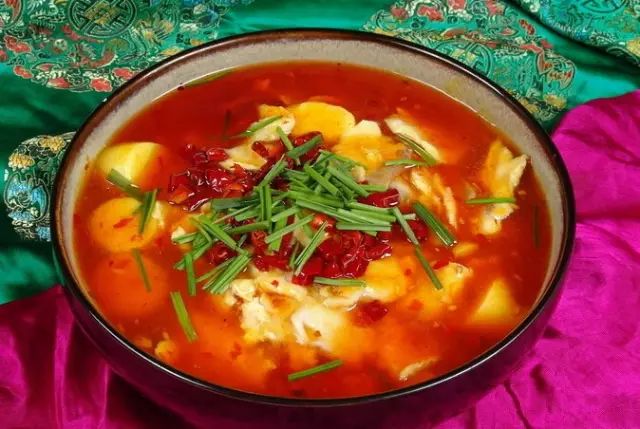 6、把煮好的鱼片连汤汁一起倒入铺好豆花的锅中,撒上花生仁、葱花、蒜末和之前炒香的辣椒段。烧热汤勺里的油(冒烟)浇在上面即可。