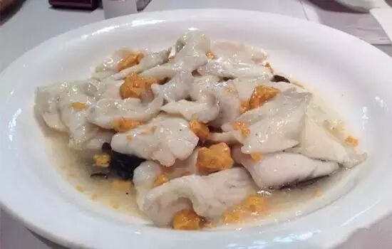 1、鸦片鱼肉改刀成4×2.5×0.3厘米的片,挂蛋液,拍玉米淀粉,入四成热油锅,滑熟捞出;黑海胆取肉。