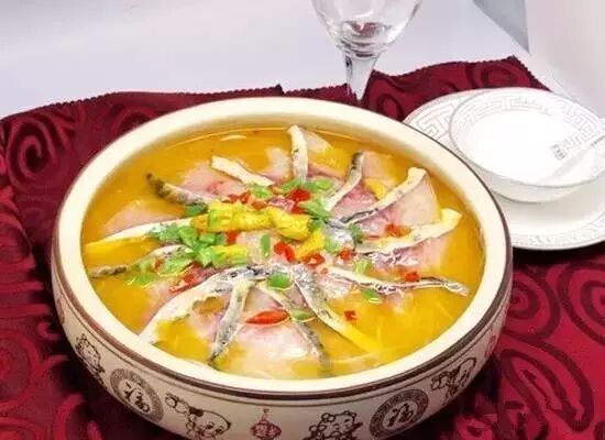 5.炒锅内留底油,回置火上,投入培红菜末和熟笋片煸炒,烹入黄酒,加进清汤,再将鱼片落锅烧沸,加入味精、用湿淀粉勾芡,淋上熟猪油即成。