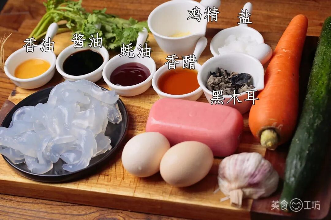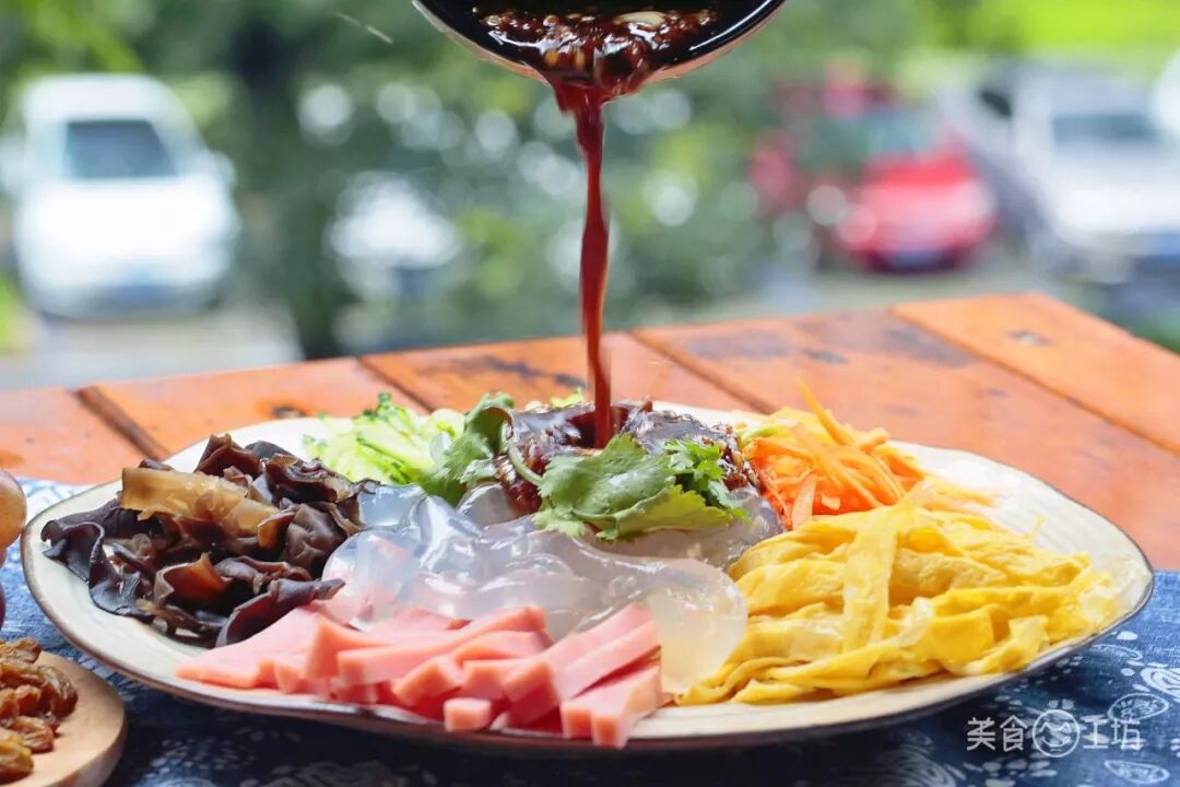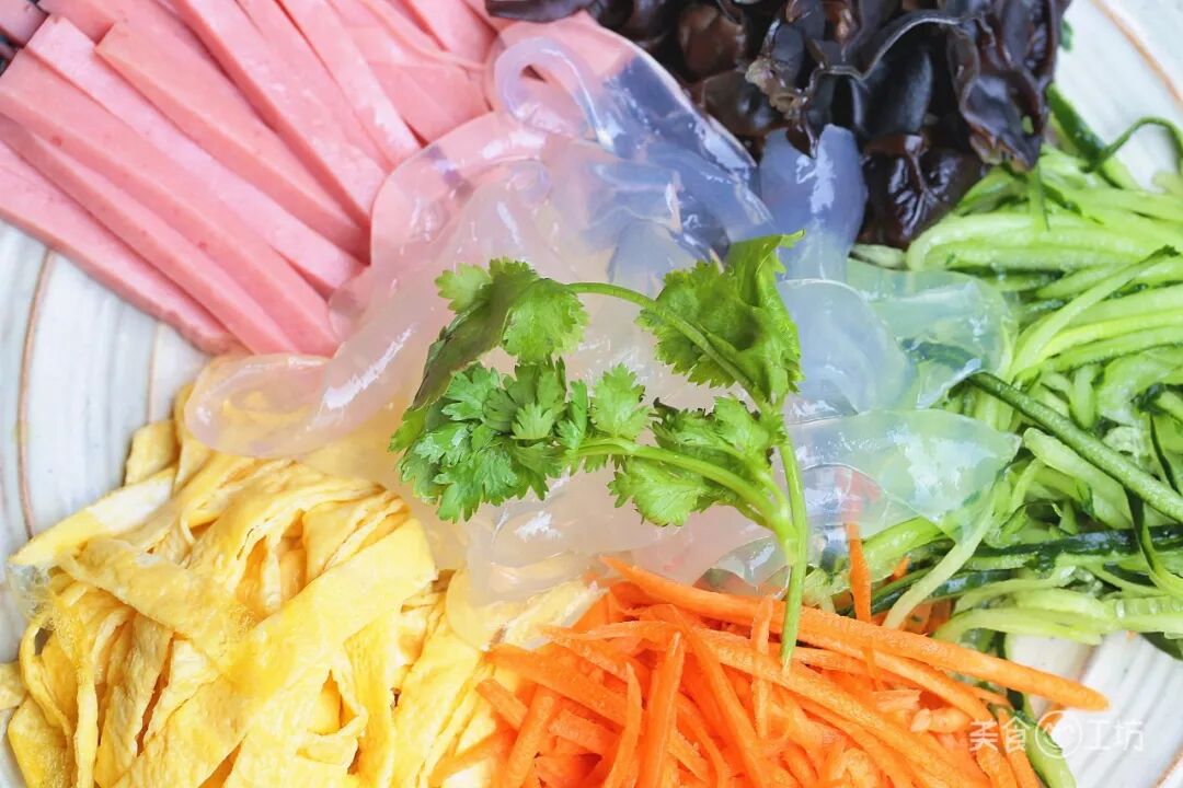 翠绿的黄瓜、橙红的胡萝卜、黝黑的木耳、粉嫩的火腿、金黄的蛋丝,这五彩聚齐,加上Q弹透明的拉皮,既有颜值也有内涵。