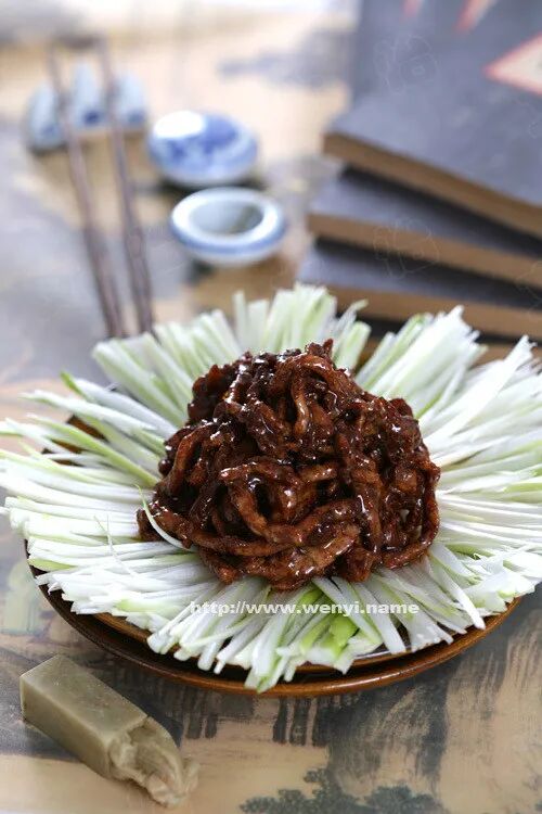 20、【京酱肉丝】 原料:猪里脊300克 大葱2根 鸡蛋1个(实际用量:蛋清半个)料酒2汤匙(30ml) 干淀粉1茶匙(5克)番茄沙司2汤匙(30克)蚝油1汤匙(15克)甜面酱2汤匙(30ml)香油1/4茶匙(1ml) 做法: 1)将里脊肉现切成3毫米厚的薄片,再切成3毫米宽的细丝。放入碗中,调入料酒,倒入半个鸡蛋的蛋清,搅拌均匀,再调入干淀粉,搅拌均匀,腌制10分钟。 2)大葱去掉绿色部分,只取葱白,洗净后切成4厘米长的段,再对半切开后,切成细丝,放入盘中摆好。 3)锅中倒入油,大火至8成热,有微微青烟冒出后,倒入肉丝,并用铲子快速滑散,炒到肉丝变色后,捞出备用。 4)锅中留少许的低油,调成小火,先倒入番茄酱,再倒入蚝油,最后倒入甜面酱,搅拌后倒入炒好的肉丝回入锅中,改成大火快速翻炒,使每条肉丝都挂上酱料,出锅前淋入一点香油,即可。