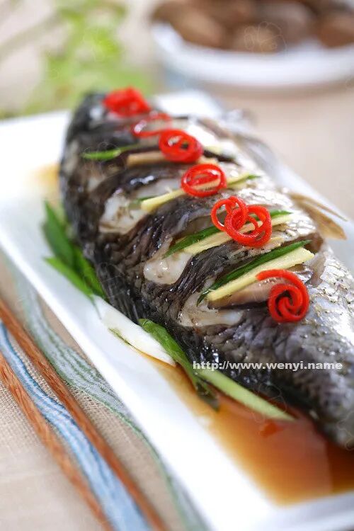 17、【清蒸鲤鱼】 原料:鲤鱼1条 蒸鱼豉油2汤匙(30ml) 盐1/2茶匙(3克) 料酒1茶匙(5ml) 水发香菇3朵 冬笋50克 青葱3根 姜10克 做法: