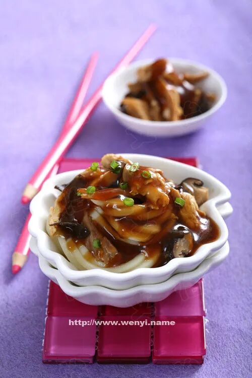 23、【鸡丝打卤面】 原料:鸡腿肉1块、鸡蛋2个、木耳3朵、香菇5朵、黄花菜15g、酱油2汤匙(30ml)、水淀粉6汤匙(90ml)、盐2茶匙(10克)、白糖1茶匙(5克)、姜2片、葱花适量 做法: 1)将锅中的水烧开,放入姜片,放入去骨鸡腿肉,撇去浮末后,改成中火慢慢煮,直到鸡肉完全成熟后(用筷子能扎透),捞出晾凉,用手将鸡肉拆丝备用。 2)干木耳、黄花菜、干香菇分别用冷水泡发备用。木耳泡发后,将上面附着的泥沙轻轻搓掉,底部硬的部份剪掉不要。将木耳切成和鸡丝粗细一致的丝。香菇泡发后,轻轻挤掉一些水分,切成小丁备用。黄花切成4厘米长的小段。 3)鸡蛋用筷子打散成蛋液。锅中倒入适量油,加热到7成,倒入木耳丝、香菇丁、黄花菜一起炒出香味,之后倒入热水没过材料,盖上盖子用中火煮10分钟。 4)加入盐、酱油和白糖。改成大火勾芡(一手拿水淀粉慢慢沿锅四周画圆倒入,另一手则拿锅铲,边倒入水淀粉边慢慢推匀。)待锅中的卤汁变得浓稠,将蛋液以画圆圈的方式慢慢倒入,并用锅铲从底部往上推匀,以免勾芡后的卤汁粘锅底。5)撒上适量葱花即可出锅,浇到煮好的面上。 来源:网络 |