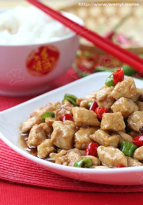 22、【家味宫保鸡】 原料:鸡胸肉250克 青红椒各4根 炸花生米50克 葱粒2茶匙(10克)姜末1茶匙(5克)蒜末1茶匙(5克)花椒15粒干红辣椒6根 调料:盐1茶匙(5克)料酒1/2茶匙(3克)干淀粉2茶匙(10克)米醋2汤匙(30ml)酱油1汤匙(15ml)白糖2茶匙(10克)清水2汤匙(30ml)水淀粉2汤匙(30ml)香油1汤匙(15ml) 做法: 1)鸡胸肉切1cm大小的丁,加入盐(1/2茶匙),料酒和干淀粉搅拌均匀后,腌制5分钟。葱切成比鸡丁稍微小点的粒,葱姜切成末。青红椒切粒。 2)将蒜葱姜放入碗中,调入盐(1/2茶匙),白糖,米醋,酱油,清水,水淀粉调成汁备用。 3)锅烧热,倒入油,再添加少许香油,趁油冷时放入花椒,待花椒出香味,颜色略变深后,放入干辣椒爆香。 4)放入鸡丁炒至变色后,将青红椒粒放入,翻炒10秒钟,倒入调好的料汁,大火翻炒1分钟后,倒入炸好的花生米即可。