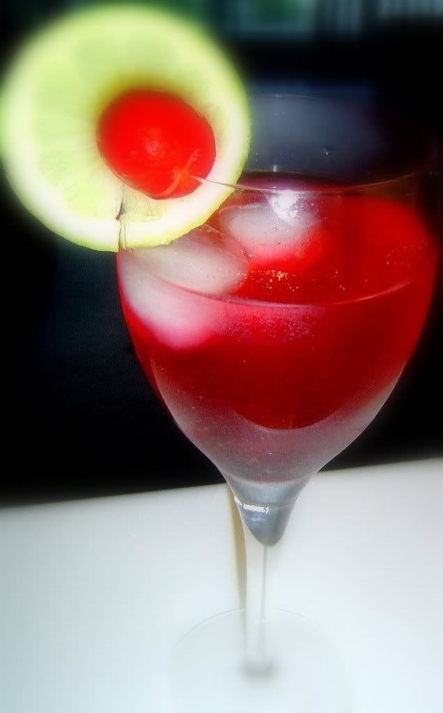 紫色雞尾酒:小半杯伏特加,兌藍莓西瓜汁加水,稍加Worcestershire汁,芹鹽和胡椒。加冰塊,lime切片加cherry裝飾。