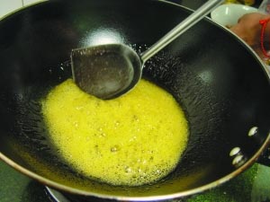 4、炒糖漿時火候控制要得宜,以小火不斷翻攪糖漿,避免其粘鍋燒焦,而且糖漿要經歷黃色泡沫—>透明狀—>黃色泡沫的過程。