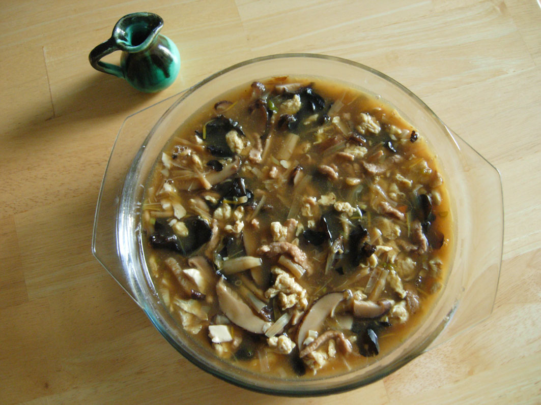 •油鍋溫熱,下蔥姜熗鍋,加香菇絲、木耳、黃花菜和炒好的瘦肉絲