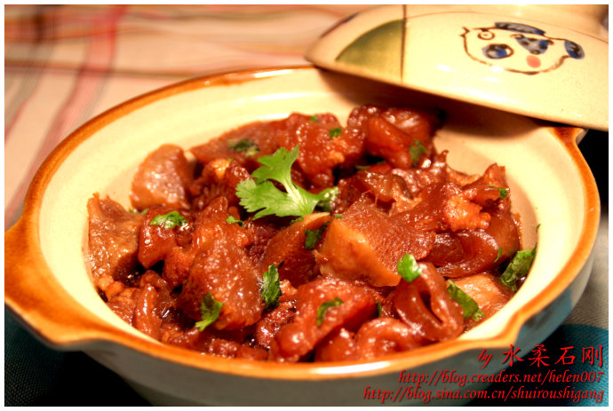 原料: . 330 g(計0.7P)牛筋(或重量可以多50-80g,影響不大) . 白蘿蔔半根,切小塊 . 少許香菜葉,切碎 調料: (一) . 少許蔥頭或1片薑片 (二) . 少許蔬菜油 . 1 . 2 個五香 . 數個花椒 . 1/8 tsp. 肉桂粉(Ground cinnamon) . 1個蒜,用刀壓扁;或1/2 tsp.蒜粉 . 2 tsp.老抽 . (三) . 1 Tbsp.紅糖 . 2 Tbsp.冰糖 . 1 Tbsp.老抽 . 1 Tbsp.生抽 . 1-1/2 tsp.鹽(喜歡咸點的就加1+1/2tsp.鹽,我家口味淡只加1 tsp.鹽) . 6 cup 水 1、燙:把牛筋放在沸水裡氽燙後撈起,然後用冷水沖洗乾淨,並切成小塊。 2、炒:在平底鍋里倒入少許蔬菜油,再倒入牛筋,再倒入調料(二)中除蔬菜油外的其他調料,中高火炒牛筋約2分鐘,使牛筋上色。 3、壓或煲:把炒過的牛筋及鍋底余料倒在高壓鍋里,再倒入調料(三),用高壓鍋高火轉低火壓1小時10-20分鐘。 4、熄火直至高壓鍋可以開鍋後,再倒入白蘿蔔低火壓10-15分鐘,使蘿蔔軟熟。 5、熄火,把牛筋和白蘿蔔取出在盤裡,及少許湯汁澆在上面。喜歡香菜味提鮮的可以加少許香菜碎拌一下。