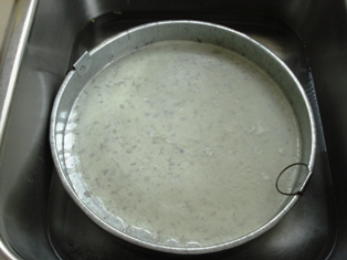 5、漂煮面皮:将搅匀的面浆,舀在抹了油的金属罗儿中,放在开水上面漂煮五分钟,拿出来后将罗儿漂在凉水里冷却,冷却后将面皮取下放在盘子里等待切拌。