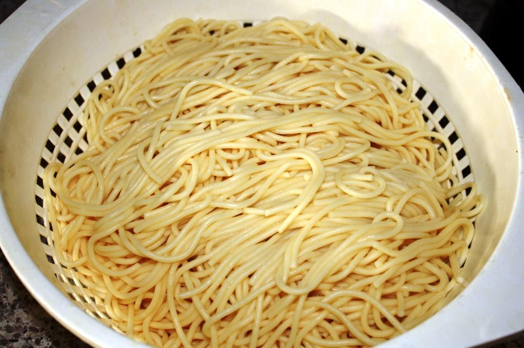 1. 面条煮好,用凉水过过,备用。(温馨提示:面条要粗一些,硬一些,太细太软的面条就成酱糊了,我用的是 spaghetti )