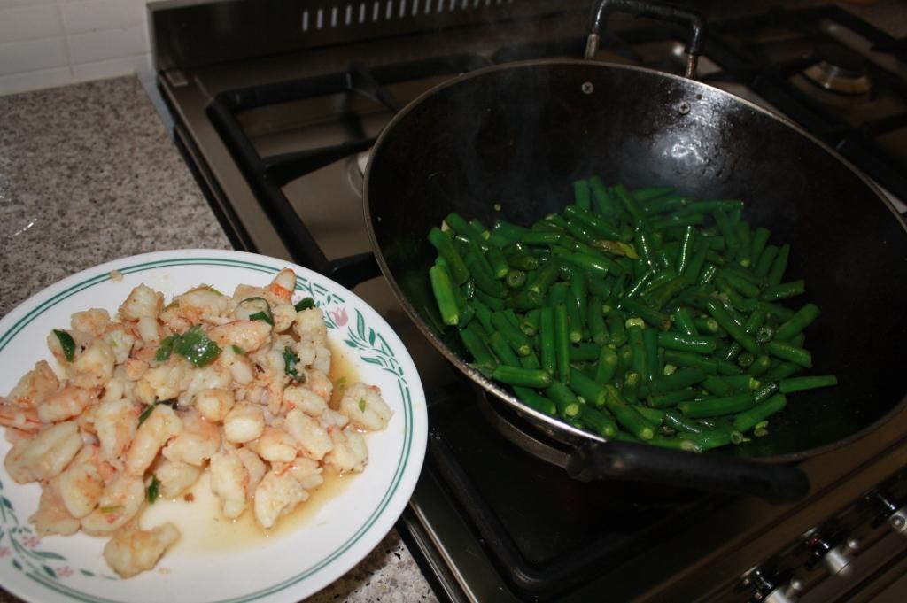 2. 去壳去头小虾 (接龙乡特产,贼好吃)用葱先爆炒出来,然后再炒豆角,想吃什么就放什么(温馨提示:锅里要放些水,防止干糊)