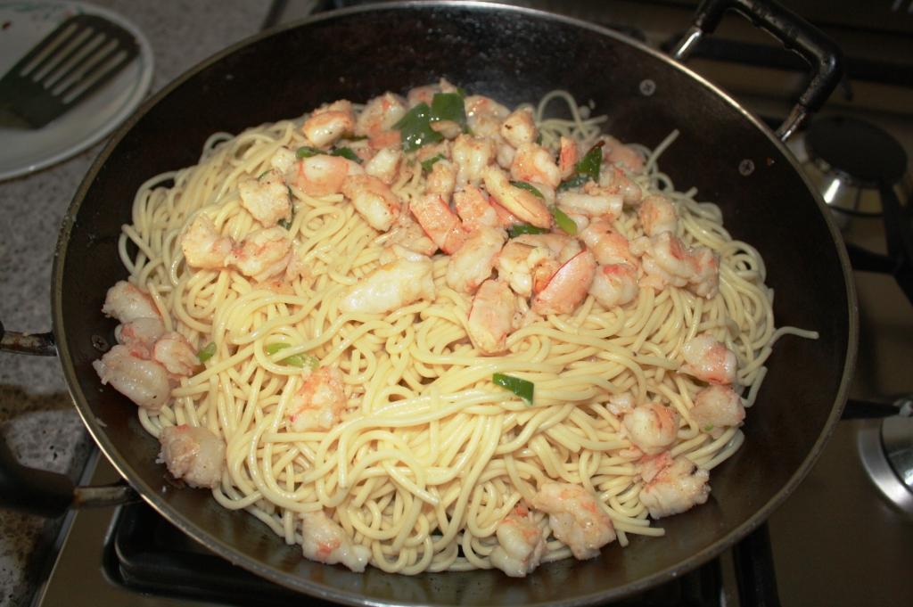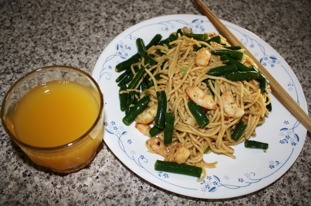 3. 豆角到8成熟,把面条倒到锅里,焖一小会儿,再把炒好的虾倒入锅中