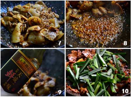 【所用料】猪后腿肉500克 生姜1块 大蒜粒2瓣 青蒜苗4根 永川豆豉1汤匙 菜籽油适量 大葱3段 黄酒2茶匙 郫县豆瓣1汤匙 1/2汤匙 花椒10粒 鸡粉1茶匙 酱油1/2汤匙匙 【这样做】 1、将净锅烧热,用手拿住瘦肉部分,使猪皮贴着锅底,烧成表皮金黄时取出,在水下刮洗干净。 2、取净锅,注入大约能淹住肉的清水,加生姜大蒜片、葱段以及花椒煮开并熬出香味。 3、把猪肉放入锅里煮,至筷子可以穿透时,捞出,立即放入冰箱急冻室,冻3至5分钟。 4、将生姜切和大蒜切成沫;青蒜苗切成马耳朵型小段。 5、将豆瓣和豆豉剁细。 6、把猪肉从急冻室取出,趁外冷里热的时候,切成薄片。 ![]() 7、炒锅内放入油,将肉片下入锅里,下入豆瓣和豆豉沫、黄酒中火炒至肉片卷成窝型。 8、把肉推到锅沿,放入生姜和大蒜炒香。 9、下入甜面酱,酱油、鸡粉炒到均匀入味,视情况看是否调入盐。 10、 下入青蒜段,炒至断生即可。 小贴士: 1、回锅一定要滚水下锅,才能封住里面的水分,成菜吃起来才更润泽一些。 2、在煮之前,最好是在水里放入生姜片、蒜片、葱段、花椒粒熬出香味,再把肉放入煮制。 3、炒的时候,若用菜籽油,能与肉片搭配出更好的效果。 4、买不到后腿肉,就用五花肉。 (赛菲) |
