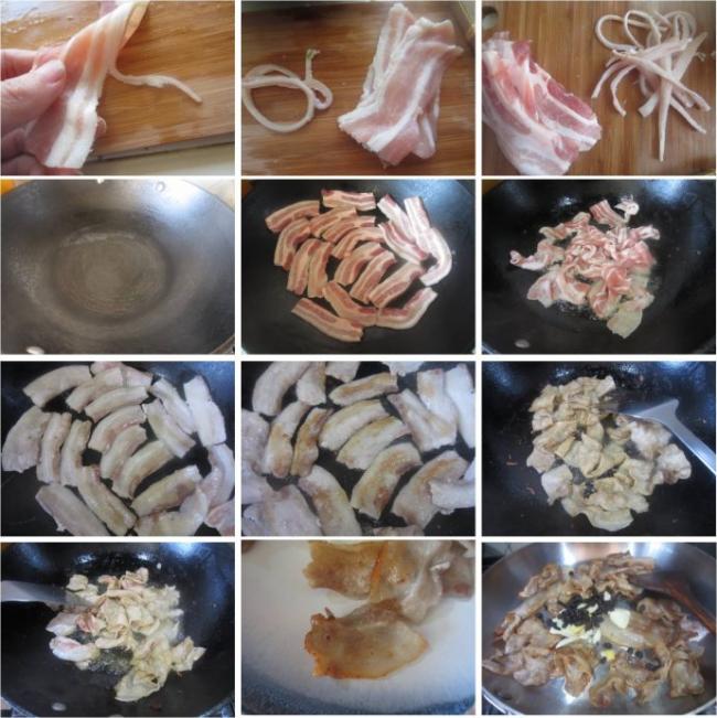 2.铁锅下少许油,烧热后加入肉片,煎出肥油,到肥肉部分半透明,肉片微微内凹,四边卷起,撒入少许盐,翻炒几下。
