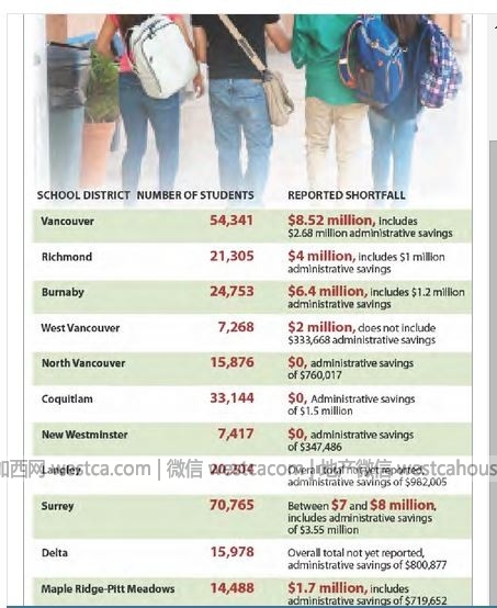 其中預算缺口最大的為溫哥華學區,出現852萬元赤字,當中有268萬元為省府所要求的節省行政開支費;