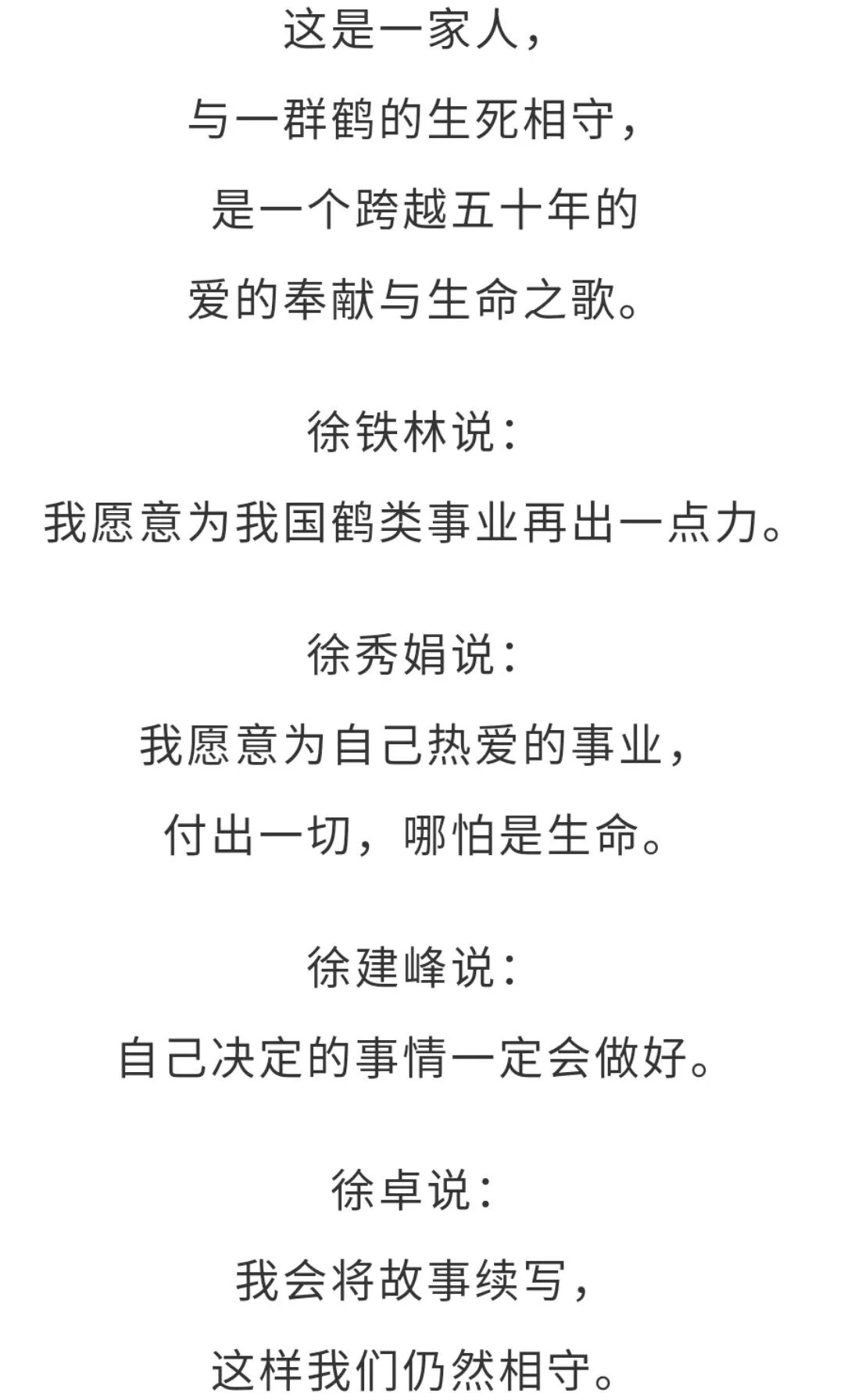 堅持一個信念,犧牲兩條生命,奉獻三代青春。 央視節目《朗讀者》第二季開播, 第一期便來了一位特殊嘉賓。 她是一名普通農民, 沒有光鮮的外表, 沒有傳奇的人生, 甚至名字都沒人聽過, 但她和她家人的故事, 卻讓董卿數次淚灑現場, 無數觀眾為之動容, 深深感動千萬中國人。 她叫徐卓, 是名普通的丹頂鶴飼養員, 故事,要從她爺爺開始說起 ...... 徐卓的爺爺徐鐵林是名漁民, 本分的生活在黑龍江扎龍濕地, 一次打漁時, 遇到一隻受傷的丹頂鶴, 便把它救回家悉心照顧, 小鶴康復後, 每天盤桓在徐家上空, 不停高鳴來表達感恩。 起初,徐鐵林還不以為意, 但屋頂丹頂鶴越聚越多, 徐鐵林便對這群大鳥產生了好感, 每次外出,他都會帶很多食物, 投餵給濕地里的丹頂鶴, 也漸漸和它們產生了感情。 1979年, 國家建立扎龍濕地保護區, 徐鐵林把自己家騰出來辦公, 還幫助工作人員聯繫住房, 保護區建成後, 他便留下來做了訓鶴員, 妻子也做起了養鶴訓鶴工作。 從那後,徐鐵林夫婦改了行, 而這一改,就是一輩子, 在保護區的幾十年間, 他摸清了區里每一個鶴巢, 熟識了濕地每一隻丹頂鶴, 還發明“半野化”孵養方式, 使濕地丹頂鶴數量不斷增長。 丹頂鶴瀕危時, 有日本收購者來這裡, 想用一輛小轎車換兩枚鶴卵, 正直的徐鐵林義當即拒絕, 收購者憤怒的離去, 徐鐵林也被嘲笑缺心眼, 而只有他自己心裡明白, 給多少錢都不能賣一枚鶴卵。 徐鐵林夫婦是中國第一代養鶴人, 奉獻自己的青春與家庭, 將一隻只丹頂鶴送上天空, 不為目的,不求回報, 開創了中國環保事業的先河。 02 徐鐵林夫妻所做的一切, 都被女兒徐秀娟看在眼裡, 受父母守鶴精神的薰陶, 她也對丹頂鶴產生感情, 甚至比父母還濃厚。 徐秀娟是家裡老大, 被親切的稱為娟子, 17歲時,高中停辦, 娟子來到保護區當臨時工, 因從小接觸加上父母薰陶, 娟子也愛鶴,很願意和鶴親近。 來到保護區後, 她工作熱情很高, 配食、護理,樣樣幹得出色, 飼養的幼鶴成活率達到100%, 還馴化小鶴表演給領導人觀賞, 人們都她為“中國第一位馴鶴姑娘”。 1984年, 娟子來到東北林大進修, 每天除了吃飯睡覺, 全部都在學習鳥類知識, 用2年時間就完成了所有課程。 (徐秀娟在鹽城孵化的3隻小丹頂鶴) 來到鹽城後, 幫助建成馴養場, 研究越冬地人工育雛技術, 同時帶來科學的繁養技術, 為鹽城保護區做出了巨大貢獻, 她的論文《越冬地丹頂鶴的飼養》, 也在鶴類保護會議上獲得一致好評。 遺體打撈那天, 在場的人無不悲傷痛哭, “黎明”和“牧仁”在天空哀鳴, 甚至落下來啄她的衣服, 而在扎龍老家, 娟子馴養過的丹頂鶴“賴毛子”, 也每天茶飯不思, 朝着南方悲鳴, 最後鬱鬱而終。 徐鐵林得知女兒犧牲時, 突然昏厥倒地, 原以為女兒如丹頂鶴一樣, 會在每年夏天時遷徙回家, 如今卻天各一方,咫尺天涯。 徐秀娟不是軍人,卻成了烈士, 是中國第一位環保烈士。 1987年9月23日, 保護區舉行徐秀娟追悼會, 近千人趕來為她送行, 那天,竟出現日全食, 連太陽都為她收起光輝, 而那兩隻被找回的幼鶴, 再也沒有貪玩飛出去過。 後來的清明, 一群丹頂鶴將橫空北上時, 在她墓前久久盤旋,不願離去 ...... 鶴南飛,魂歸故里 人仍在,護一方土地! 徐秀娟的奉獻, 是父母願望的繼承, 更是自己信念的升華。 因執着, 上帝讓她青春永駐, 因善良, 上帝讓她永遠23歲, 年華雖易逝,芳華仍永存。 03 大女兒徐秀娟犧牲了, 但徐家人和丹頂鶴的故事, 還遠遠沒有結束。 1997年, 徐秀娟弟弟徐建峰退伍, 為繼續家人事業, 他放棄國企工作, 再次回到扎龍濕地。 受父母和姐姐影響, 徐建峰工作更加認真負責, 有次進行丹頂鶴放飛表演, 不小心摔壞了腳, 但他仍忍着劇痛完成任務。 同時開展丹頂鶴散養研究, 在他帶領下,自2008年來, 丹頂鶴繁育率創建區最高, 育雛成活率也達90%以上。 在疫病防控高危期, 徐建峰連續工作7天7夜, 在丹頂鶴繁殖季節, 徐建峰徒步穿行保護區核心, 從業18年,徐建峰兢兢業業, 從訓鶴員,成長為保護區帶頭人, 而這一切的一切, 都離不開父母和姐姐, 遺傳給他的堅定信念。 生前,他常常, 出神地看自己的工作證, 後來人們整理遺物時發現, 他在工作證背後, 藏了一張姐姐徐秀娟的照片。 原來, 這個沉默寡言的漢子, 默默繼承着姐姐的事業, 用生命與姐姐遙相唱和。 蘆葦盪還是那片蘆葦盪, 徐建峰救的丹頂鶴和鶴卵, 也已孵化成長,翱翔天空, 小鶴們永遠不會知道, 它們的救命恩人已遠去, 成為了濕地的永世守護神。 女兒消逝的痛苦未解, 兒子又突然撒手離去, 年邁的徐鐵林和老伴, 再次遭受精神打擊, 他們每天站在村口眺望, 期盼“娟子”和“峰兒”, 跟隨着遷徙的丹頂鶴, 從南方飛回家鄉。 可是一年一年過去了, 丹頂鶴一年一年飛回來, “娟子”和“峰兒”, 卻再也沒有回來 ...... 《中庸》裡說: “唯天下之至誠,為能盡其性; 能盡其性,則能盡人之性; 能盡人之性,則能盡物之性。” 徐秀娟和徐建峰姐弟倆, 用他們的赤誠之心, 感化着每一隻丹頂鶴, 將這群有靈性的大鳥, 與自己的靈魂融為一體。 鶴鳴於野,聲聞八荒, 烈士嘉范,四海傳揚。 04 一家兩代人,歷經半世紀, 他們努力着,奉獻着, 用青春與生命, 譜寫着濕地里的壯歌。 而徐家人與丹頂鶴的故事, 仍沒有完結...... 像祖輩父輩人一樣, 徐卓穿梭在高高的蘆葦盪里, 筆記本上整齊記錄着丹頂鶴 